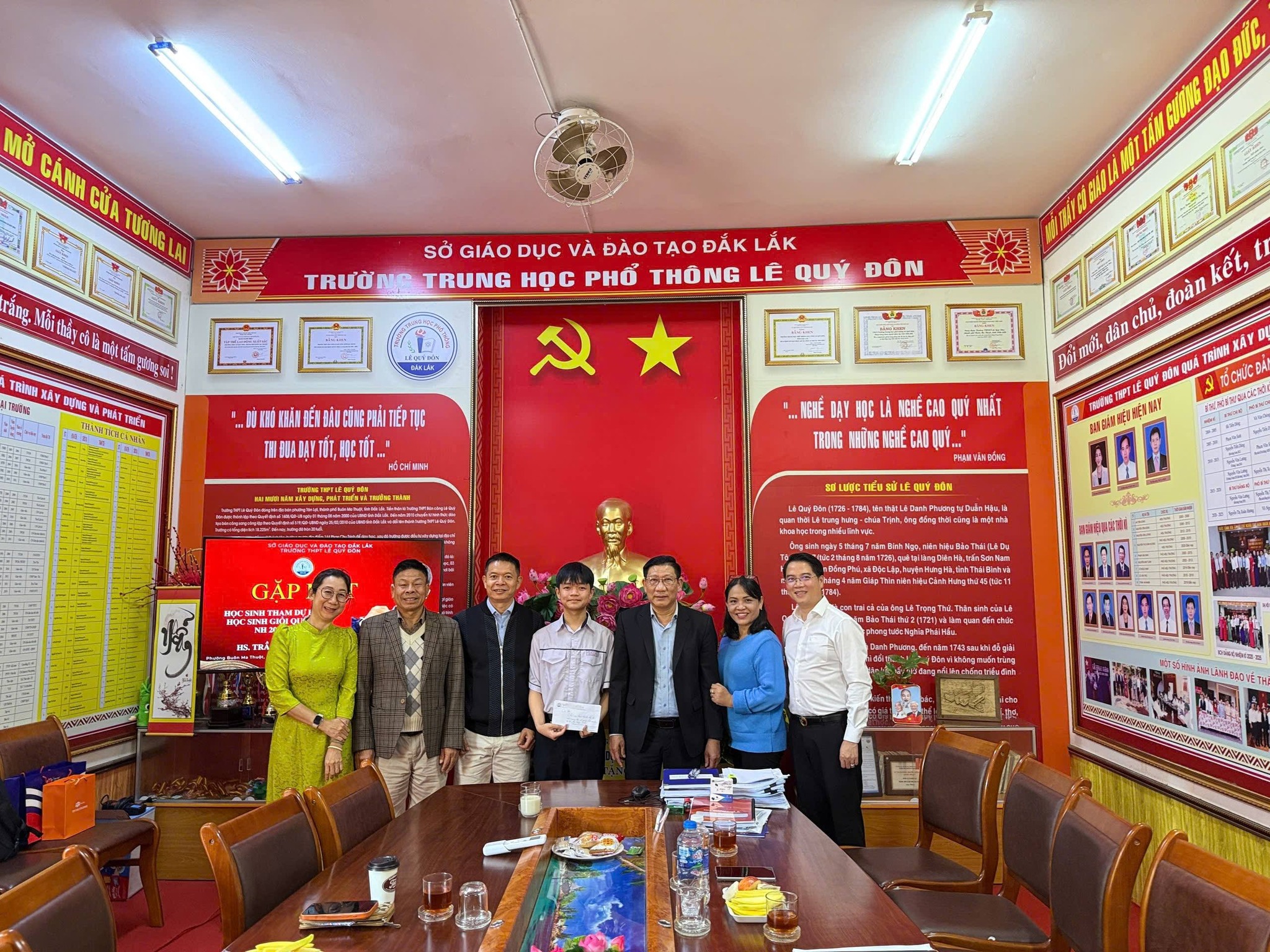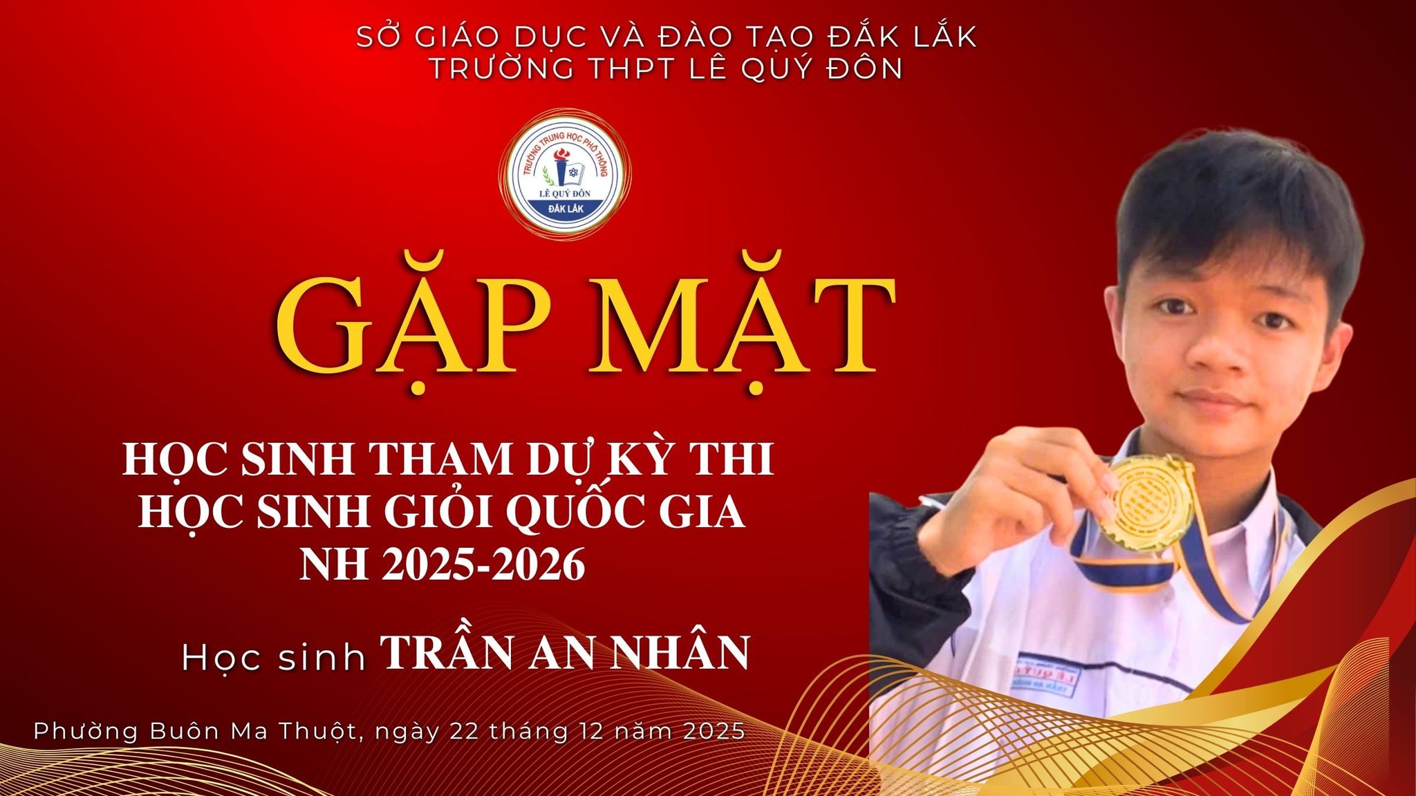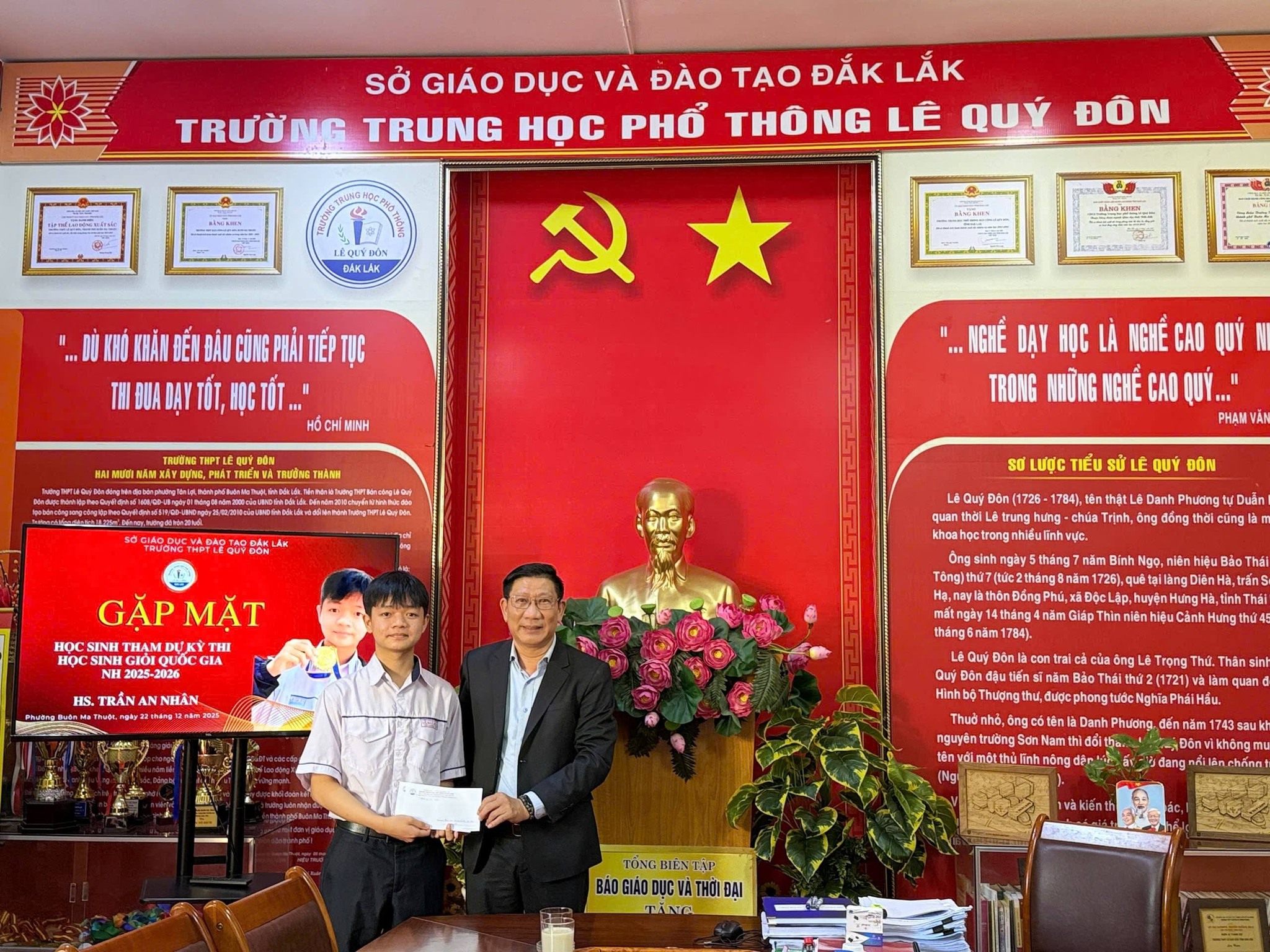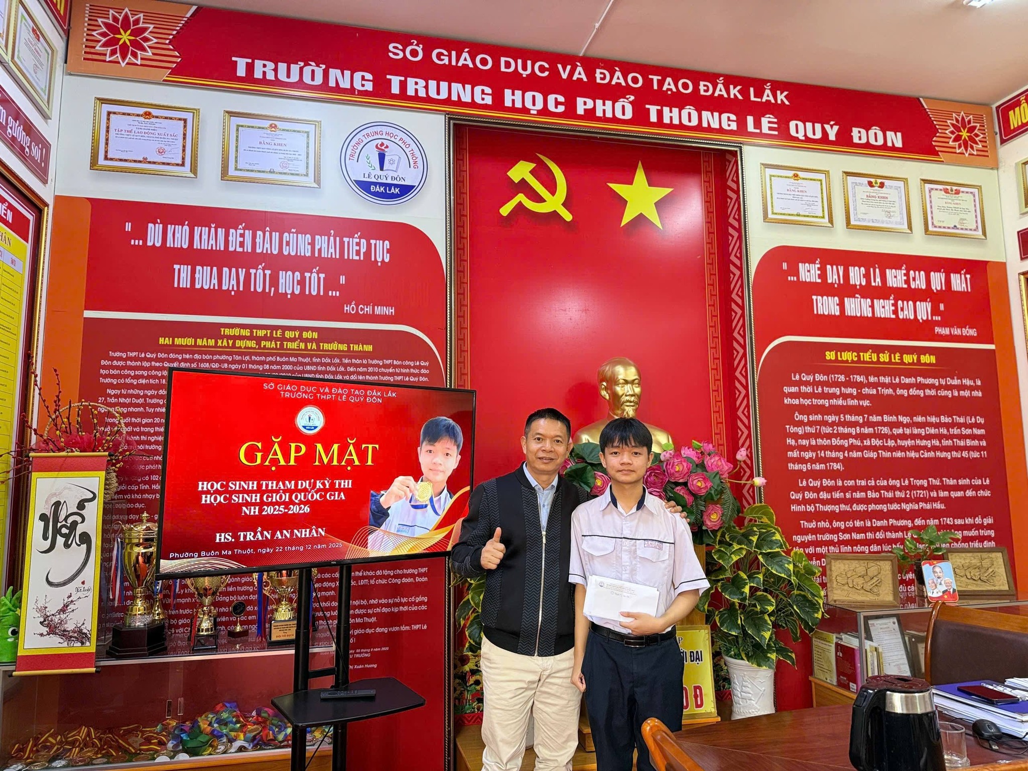 Nhằm kịp thời động viên, khích lệ tinh thần học sinh trước thềm Kỳ thi học sinh giỏi Quốc gia năm học 2025 – 2026, sáng nay, Ban Giám hiệu Trường THPT Lê Quý Đôn – Đắk Lắk cùng đại diện Hội Khuyến học và Hội Cha mẹ học sinh nhà trường đã có buổi gặp gỡ em Trần An Nhân – lớp 12A7 – là học sinh vinh dự tham gia kỳ thi quan trọng này.